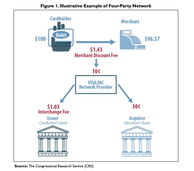 In 2010, Congress actually noticed this was a problem, Senator Dick Durbin attached an amendment to the Dodd-Frank Act which regulated these networks. Specifically, the Durbin Amendment did two things. It had the Fed impose a price cap on swipe fees for debit cards, and it allowed merchants to choose among debit networks for processing debit payments. While the Fed tilted the rules as far as it could towards banks, the Durbin amendment has delivered somewhat for merchants. (The Durbin Amendment only addressed debit cards, not credit cards, and so it left out large chunks of the market. There’s now Senate legislation, called the Credit Card Competition Act, which would allow merchants to choose among multiple payment networks for credit cards.)