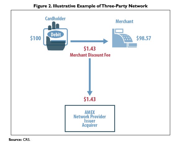 There’s a difference between American Express and Visa/Mastercard. Visa and Mastercard don’t issue their own cards, banks issue them. Conversely, banks don’t issue American Express cards, only American Express does that. So American Express isn’t a standard credit card network. It is technically a ‘three-party system,’ between consumers, merchants, and American Express itself. This distinction matters for legal reasons. (Though American Express’s status as a three party network isn’t strictly accurate, U.S. Bank does issue credit cards that operate on AMEX).