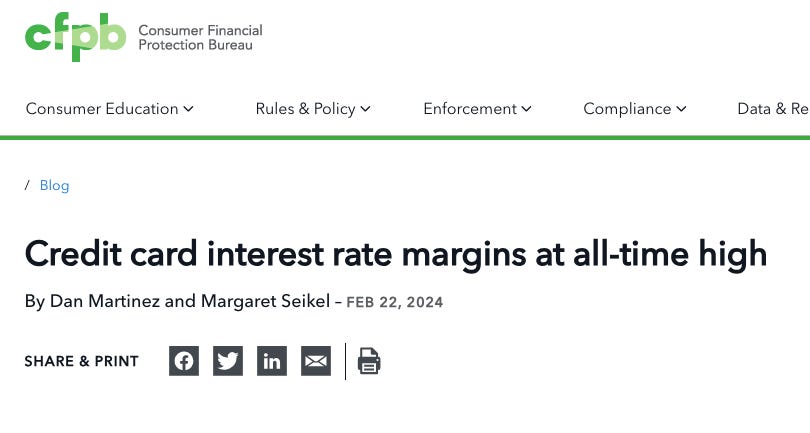 There are many barriers to entry in the credit card business, and significant pricing power among incumbents. As the Consumer Financial Protection Bureau found, margins for credit cards are persistent, increasing, high, and tilted towards the larger firms in the industry. (And this is true even when you take higher interest rates into account.)